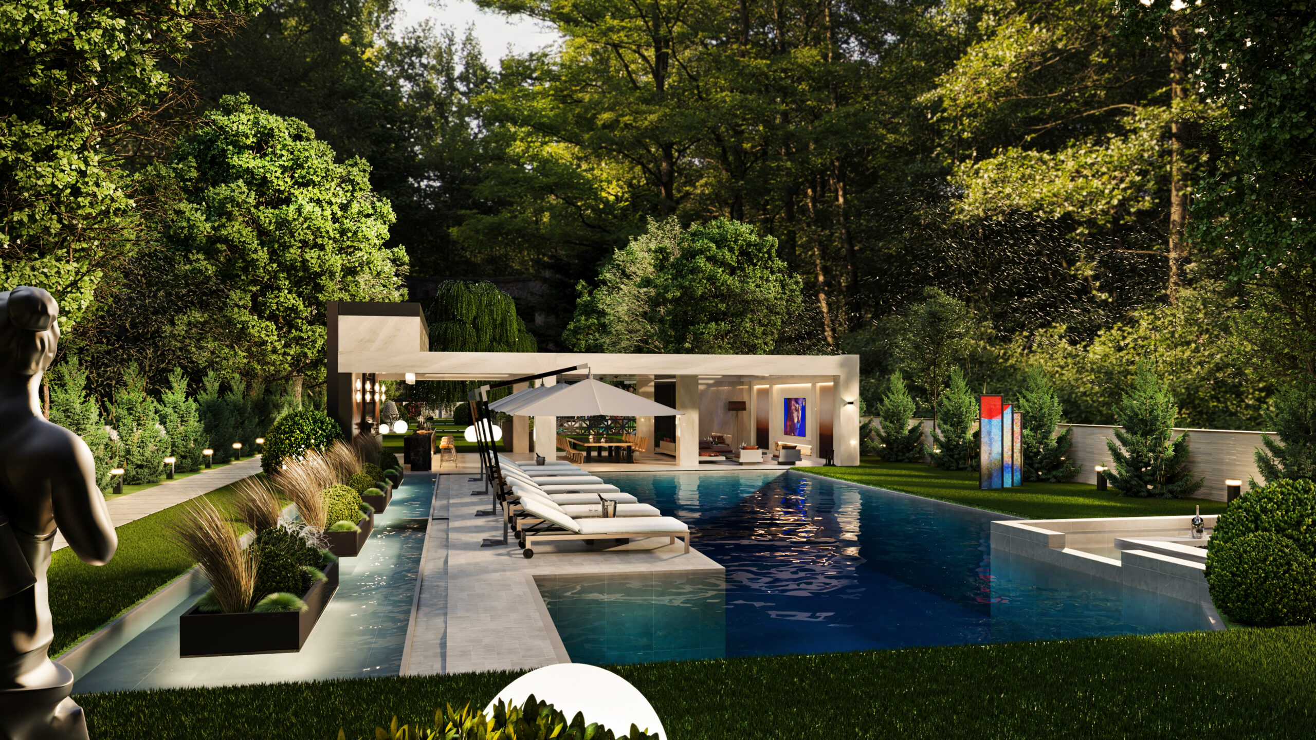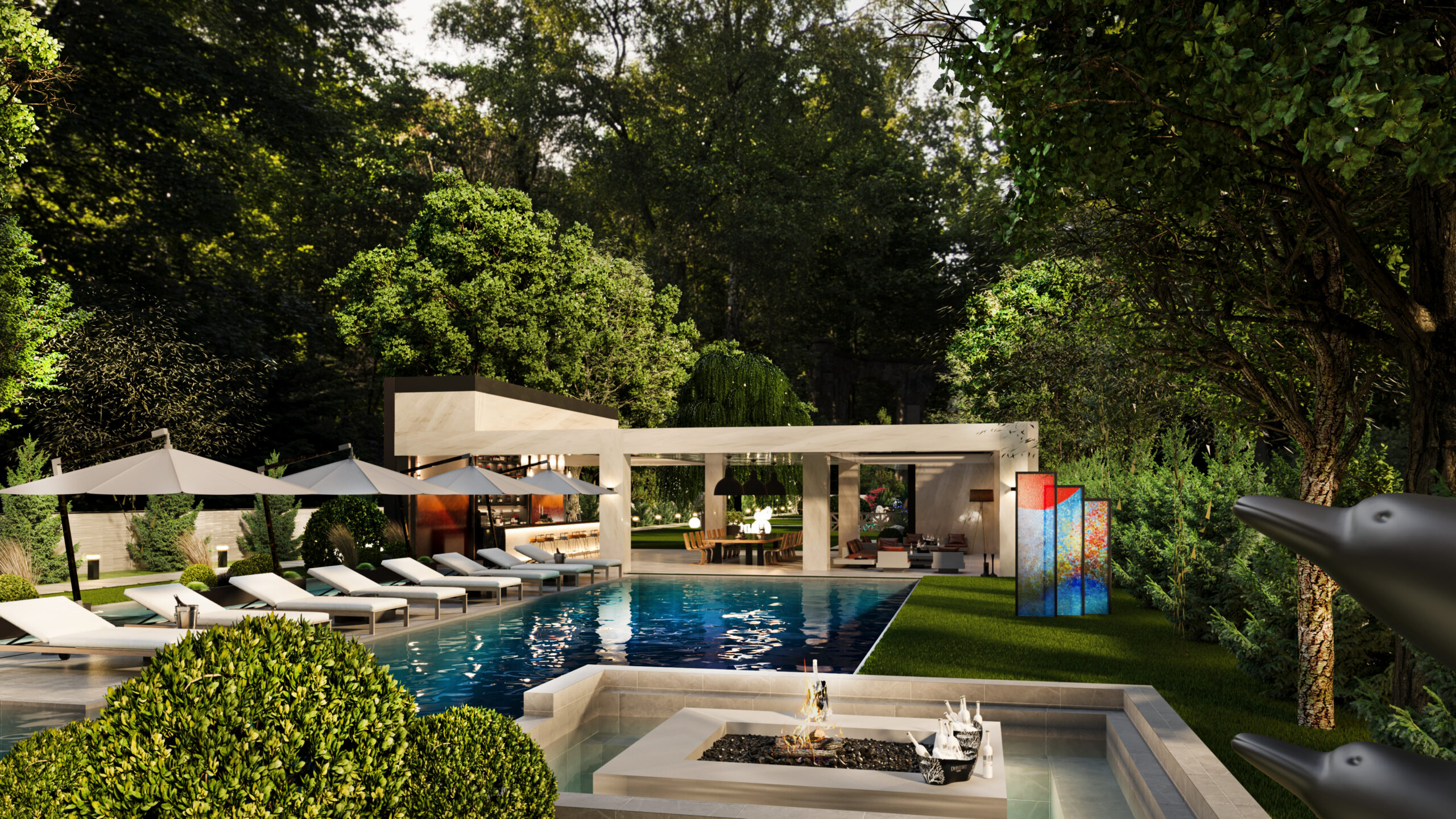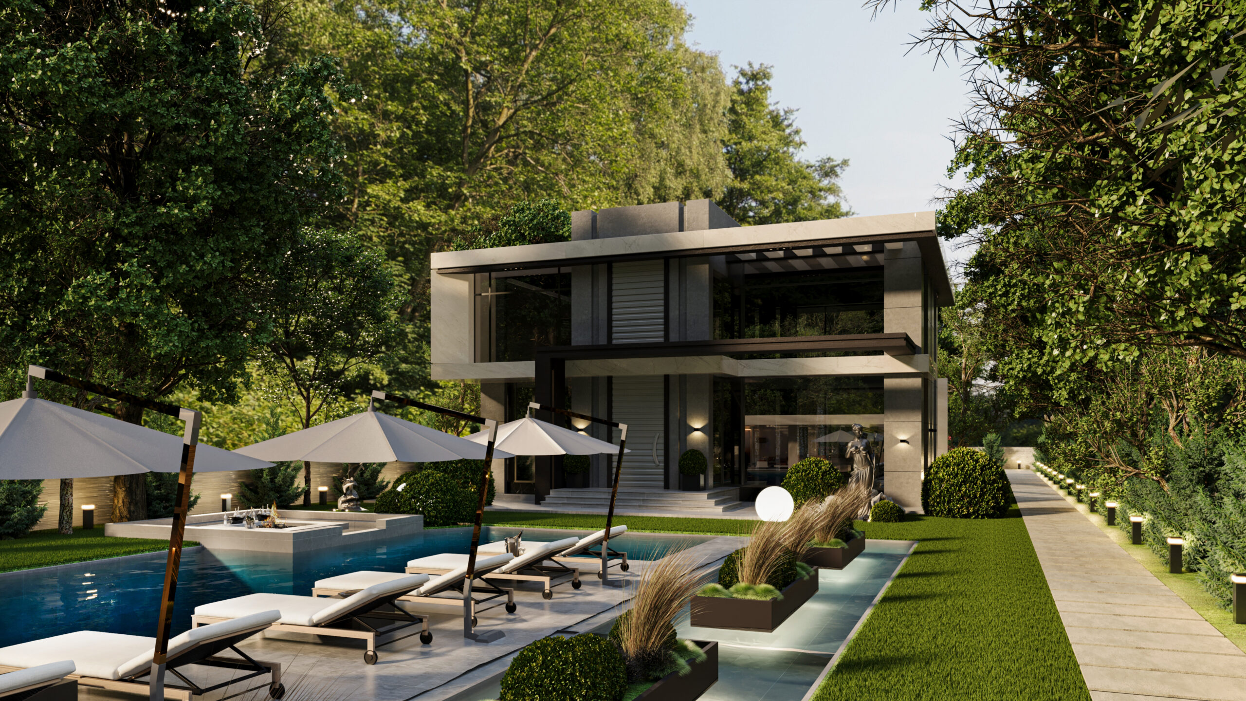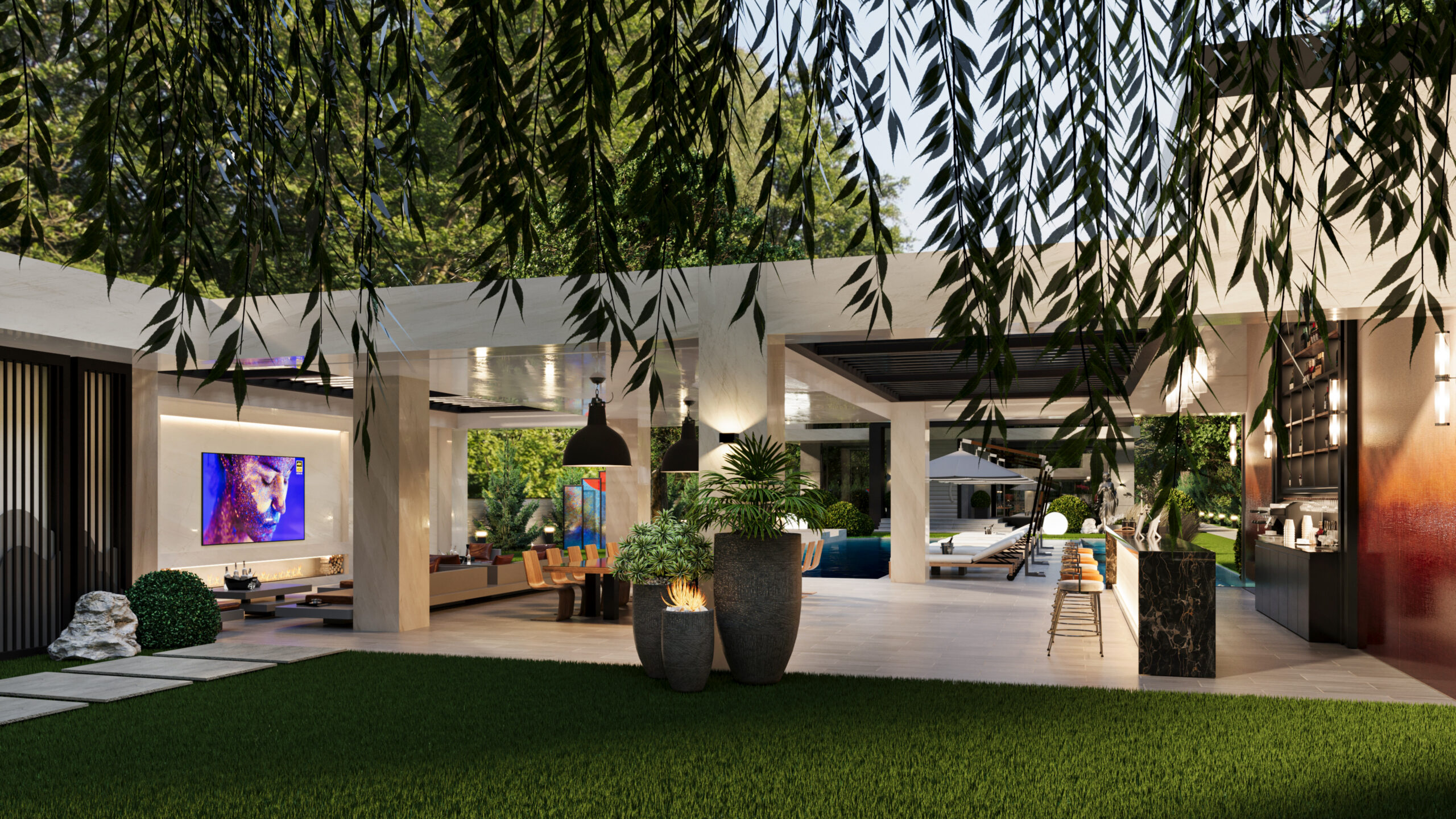 Doğayla bütünleşen modern mimarisiyle bu villa, estetik ve lüksü aynı anda sunuyor. Girişten itibaren sizi karşılayan geniş peyzaj alanı, doğal dokularla zenginleşirken; su öğeleri ve heykelsi detaylar mekâna zarafet katıyor. Açık yaşam alanları, modern bar ve lounge bölümleriyle sosyalleşmeye davet ederken; uzun havuz, dinlenme alanlarıyla tatil konforunu evinize taşıyor. Doğal taş dokuları, modern çizgilerle birleşiyor; gece aydınlatmalarıyla birlikte etkileyici bir atmosfer yaratıyor. Bu tasarım, modern yaşamın tüm ayrıcalıklarını doğanın huzuru ile harmanlıyor.