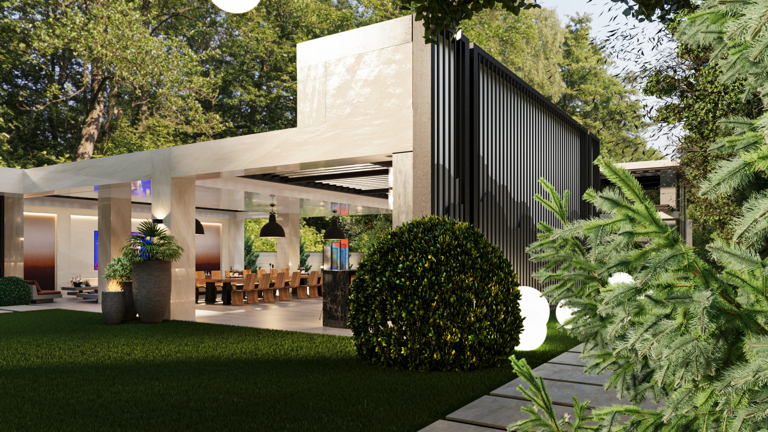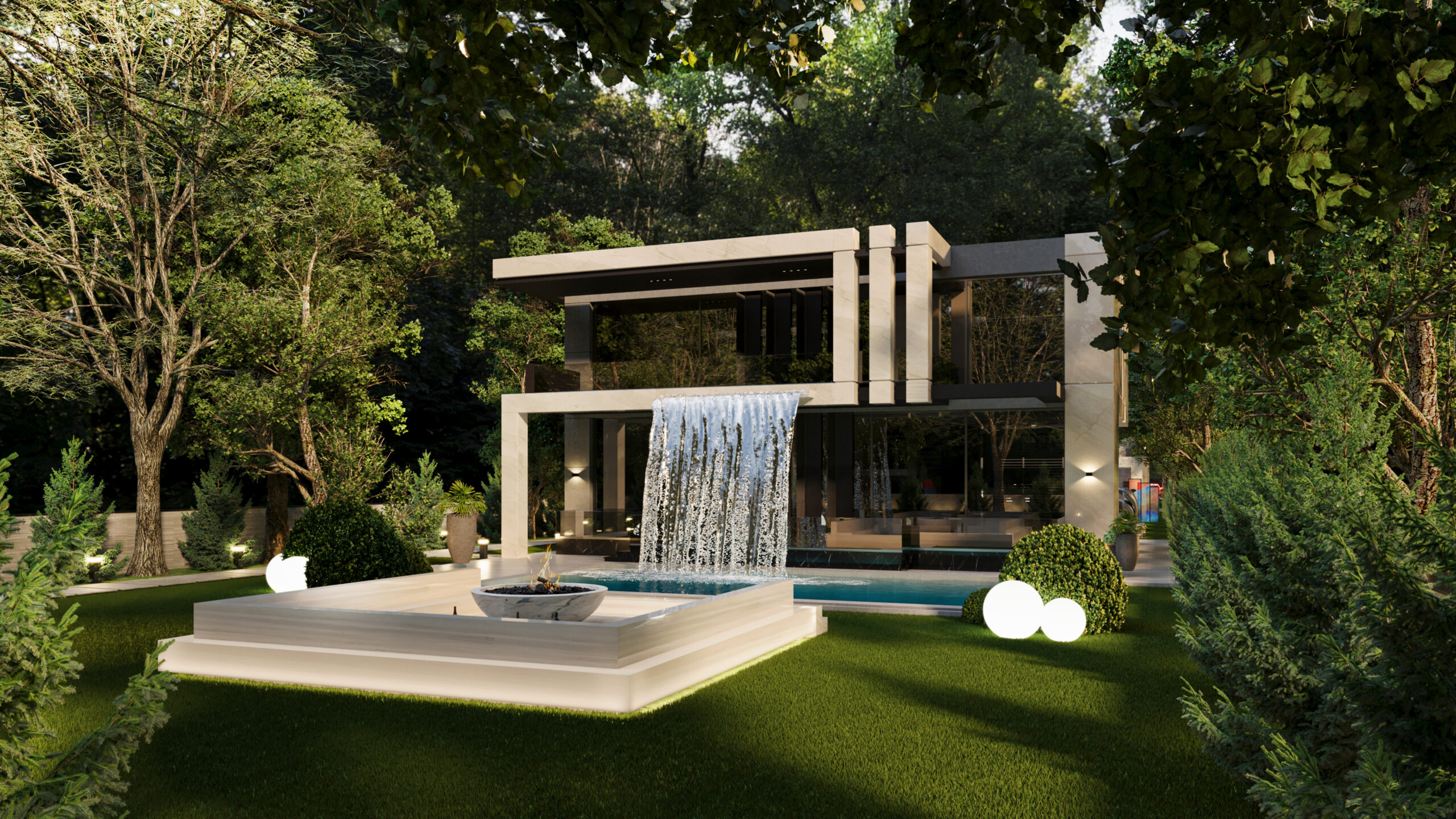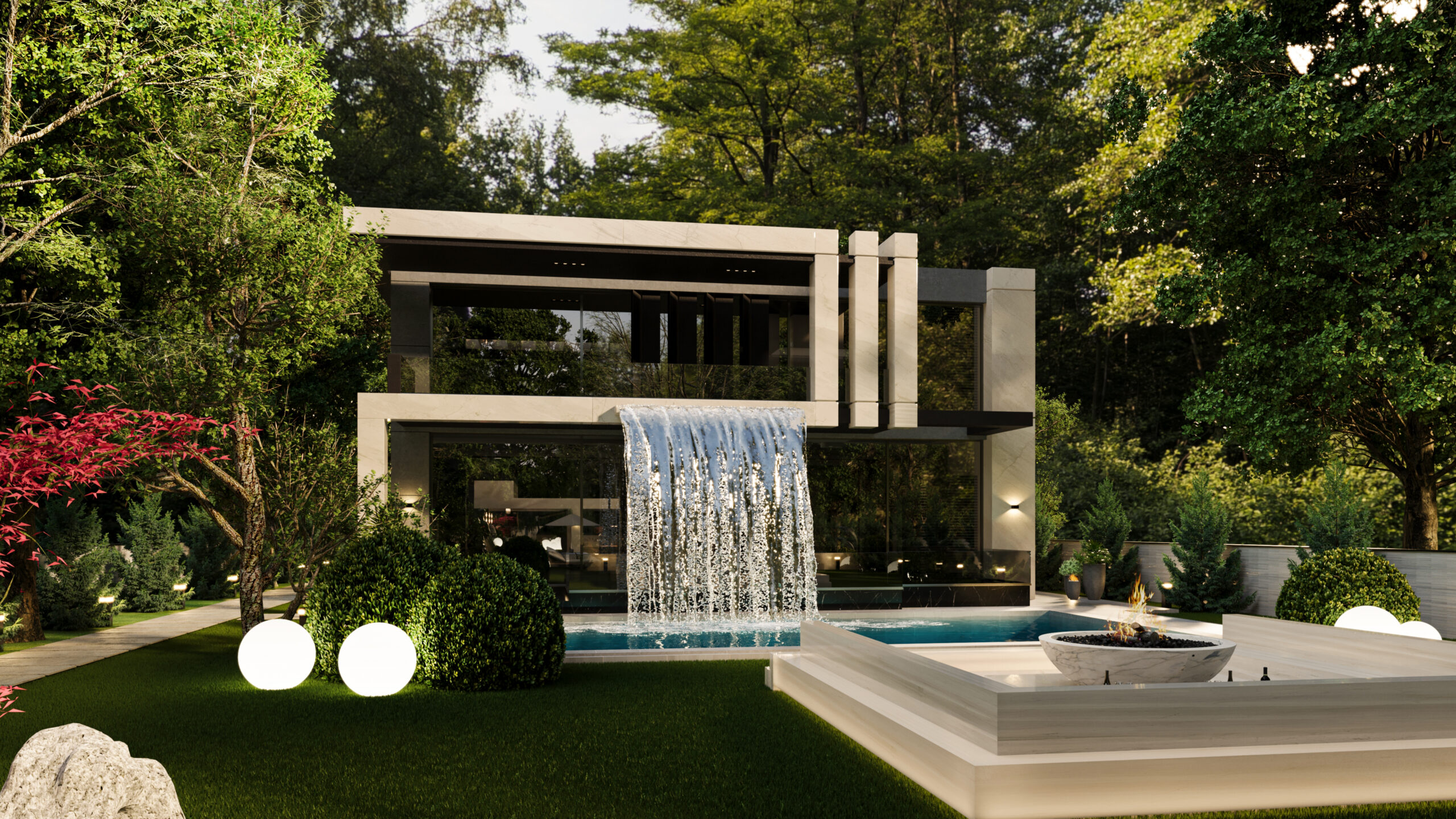 Doğayla bütünleşen modern mimarisiyle bu villa, estetik ve lüksü aynı anda sunuyor. Girişten itibaren sizi karşılayan geniş peyzaj alanı, doğal dokularla zenginleşirken; su öğeleri ve heykelsi detaylar mekâna zarafet katıyor. Açık yaşam alanları, modern bar ve lounge bölümleriyle sosyalleşmeye davet ederken; uzun havuz, dinlenme alanlarıyla tatil konforunu evinize taşıyor. Doğal taş dokuları, modern çizgilerle birleşiyor; gece aydınlatmalarıyla birlikte etkileyici bir atmosfer yaratıyor. Bu tasarım, modern yaşamın tüm ayrıcalıklarını doğanın huzuru ile harmanlıyor.