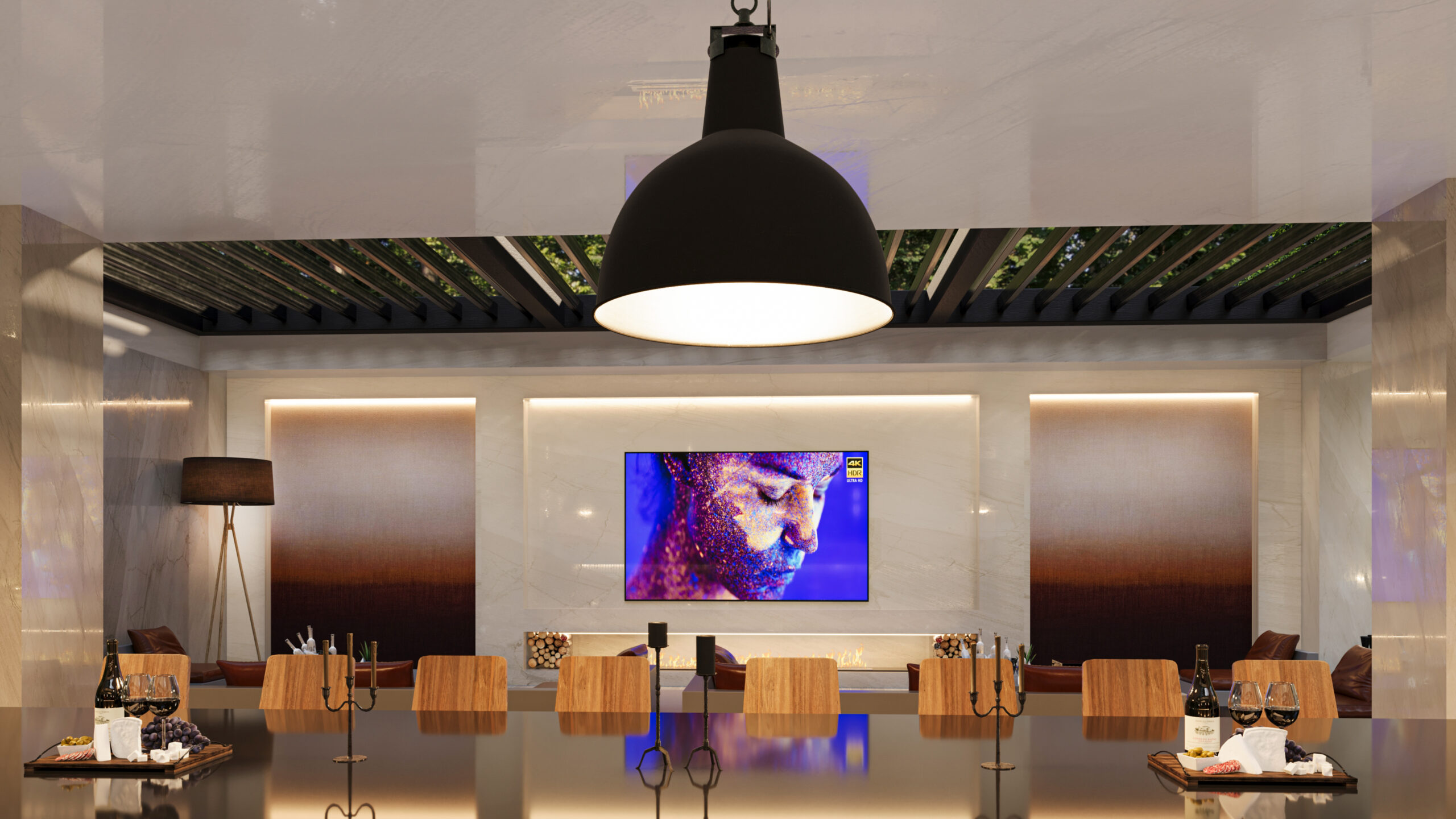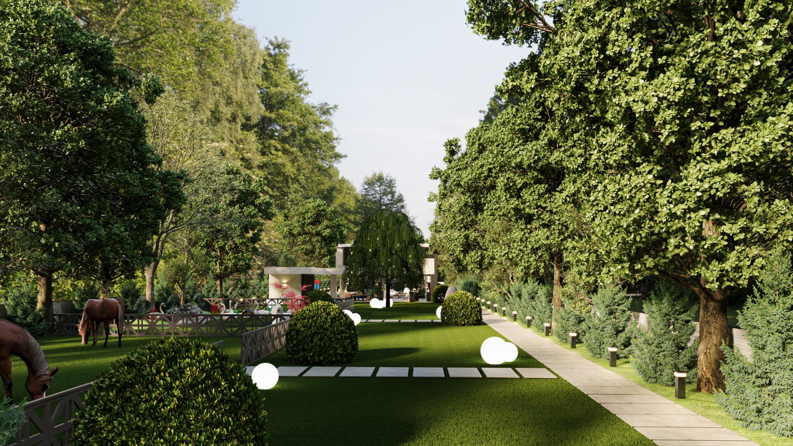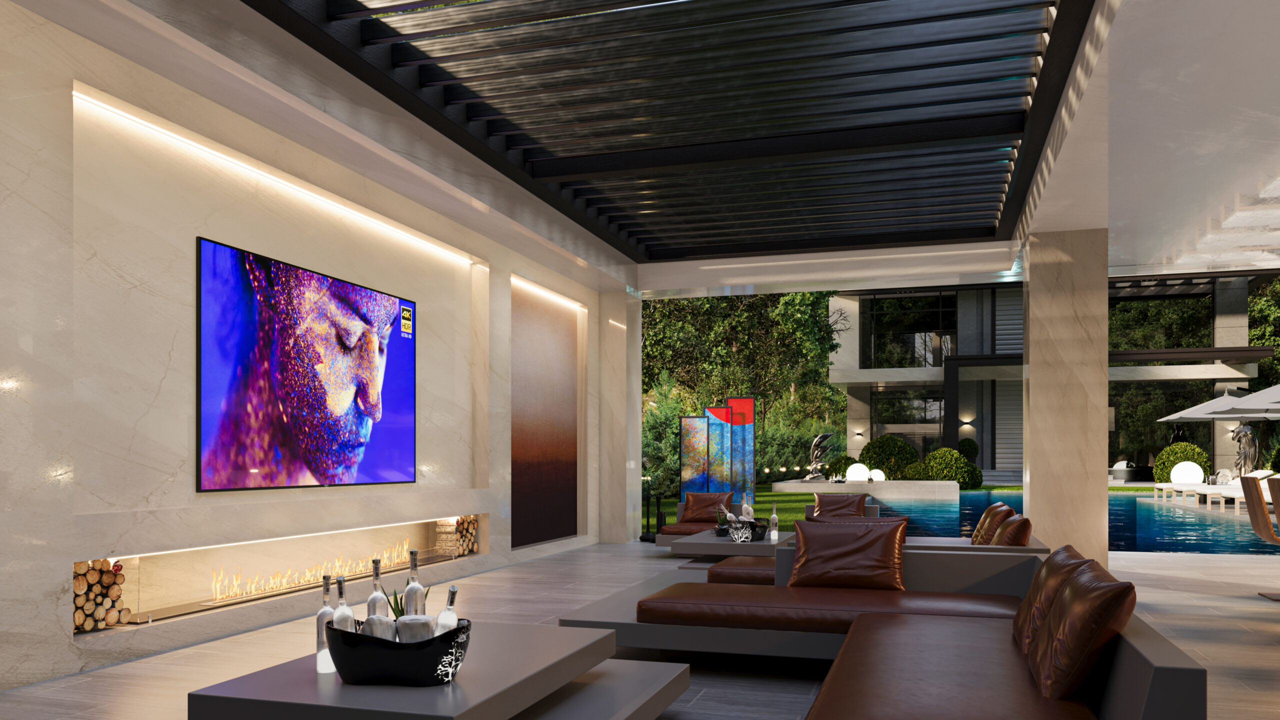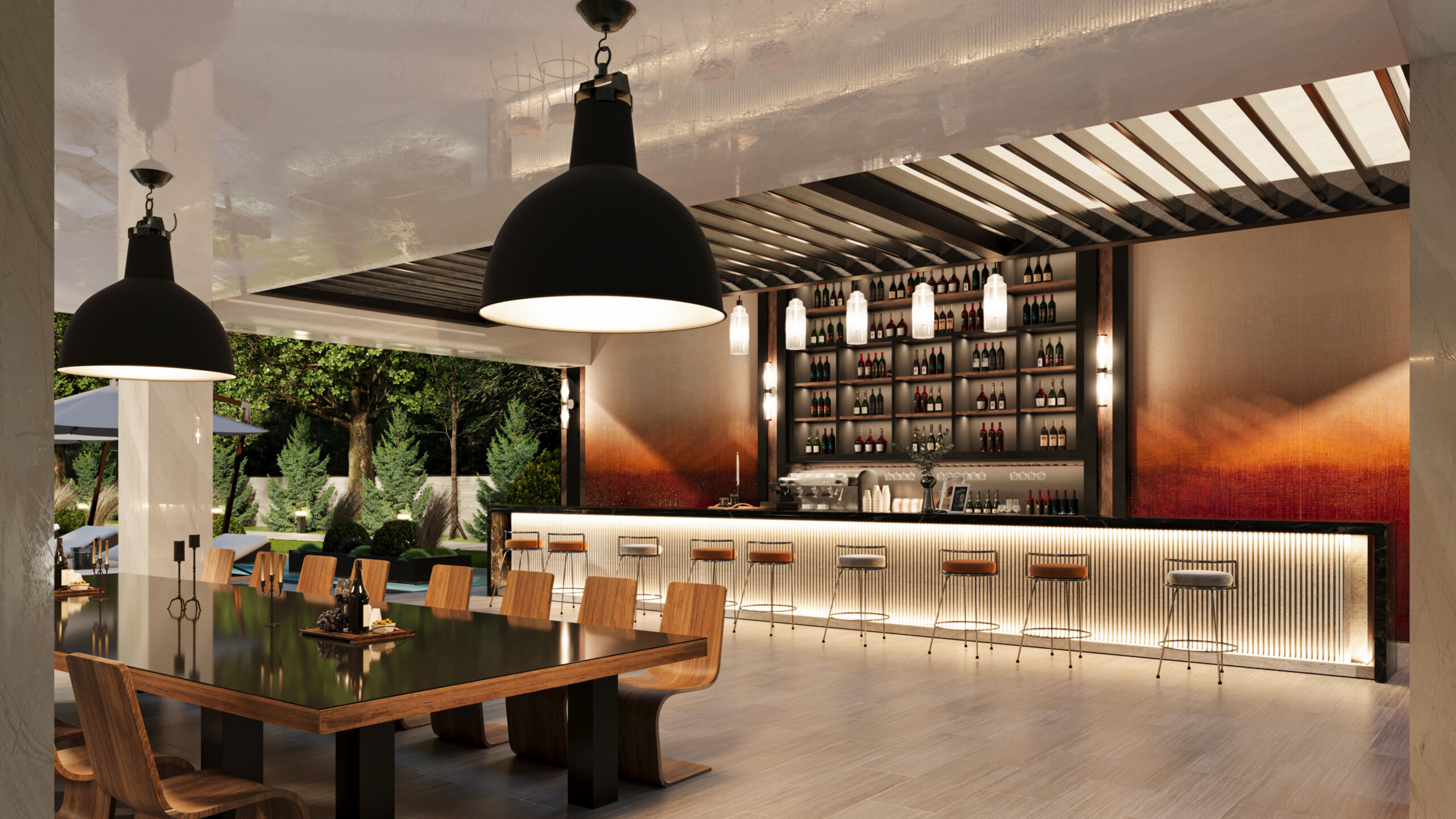 Doğayla bütünleşen modern mimarisiyle bu villa, estetik ve lüksü aynı anda sunuyor. Girişten itibaren sizi karşılayan geniş peyzaj alanı, doğal dokularla zenginleşirken; su öğeleri ve heykelsi detaylar mekâna zarafet katıyor. Açık yaşam alanları, modern bar ve lounge bölümleriyle sosyalleşmeye davet ederken; uzun havuz, dinlenme alanlarıyla tatil konforunu evinize taşıyor. Doğal taş dokuları, modern çizgilerle birleşiyor; gece aydınlatmalarıyla birlikte etkileyici bir atmosfer yaratıyor. Bu tasarım, modern yaşamın tüm ayrıcalıklarını doğanın huzuru ile harmanlıyor.